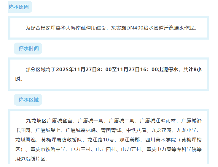 据重庆自来水有限公司消息 2025年11月27日 重庆部分区域将停水 请提前做好储水准备 ↓↓↓
