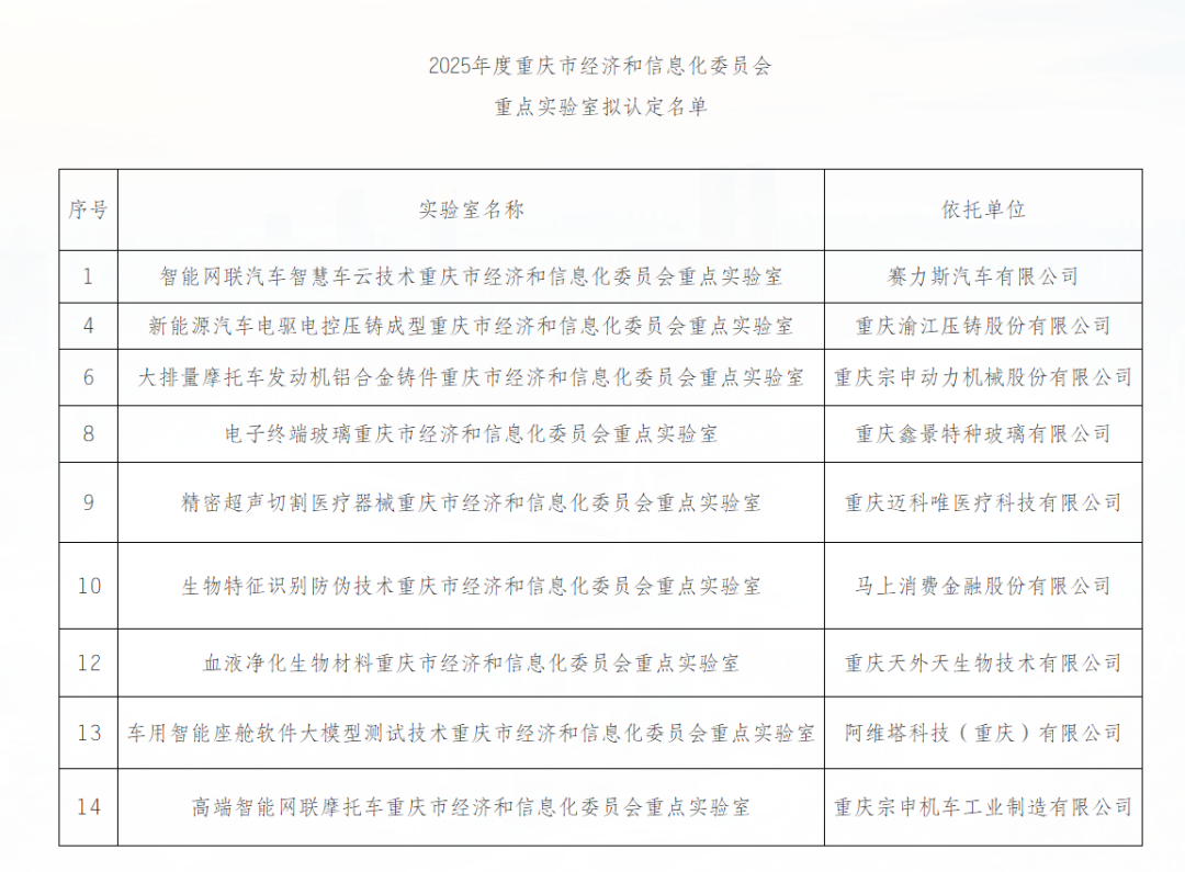 近日,重庆市经济信息委公示“2025年度重庆市经济和信息化委员会重点实验室拟认定名单”,全市9家重点实验室入选。其中,两江新区企业赛力斯、马上消费、迈科唯等7家企业所建的重点实验室上榜。