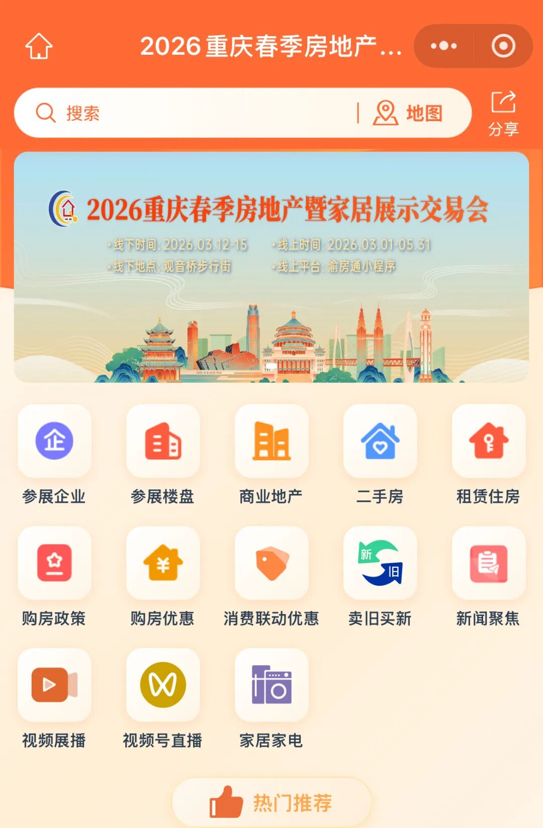 本届春交会采取线上线下联动展示,线下展会3月12日—15日在两江新区观音桥步行街举行,线上展会将持续至5月31日,期间线上平台将实时更新房源信息、优惠政策和活动动态。市民可通过渝房通平台、抖音等渠道参与展会,一站式享受看房、选房、咨询、申领优惠等全流程服务。